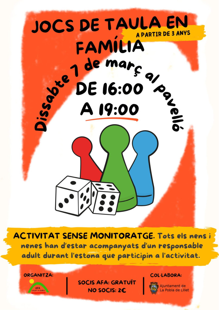 El Pavelló Municipal de La Pobla de Lillet acull una tarda de jocs de taula en família per a infants a partir de 3 anys de 16 a 19 h.