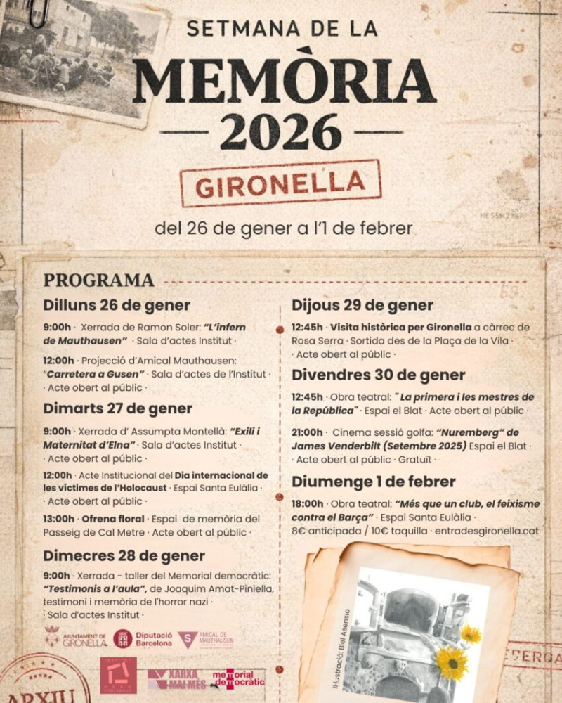 Entre els actes destacats també hi ha la xerrada oberta “L’exili i la maternitat d’Elna”, la projecció audiovisual “Carretera a Gussen”, la visita històrica a Gironella i l’obra teatral “Més que un club, el feixisme contra el Barça”.