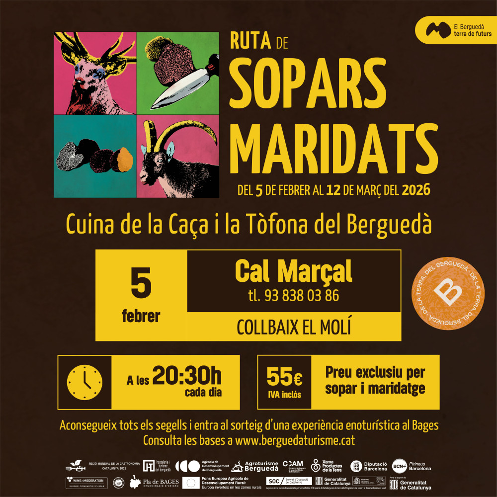 La Ruta s’inicia el 5 de febrer, a les 20.30 h, amb un primer sopar al restaurant Cal Marçal de Puig-reig i la proposta gastronòmica es marida amb vins de Collbaix el Molí.
