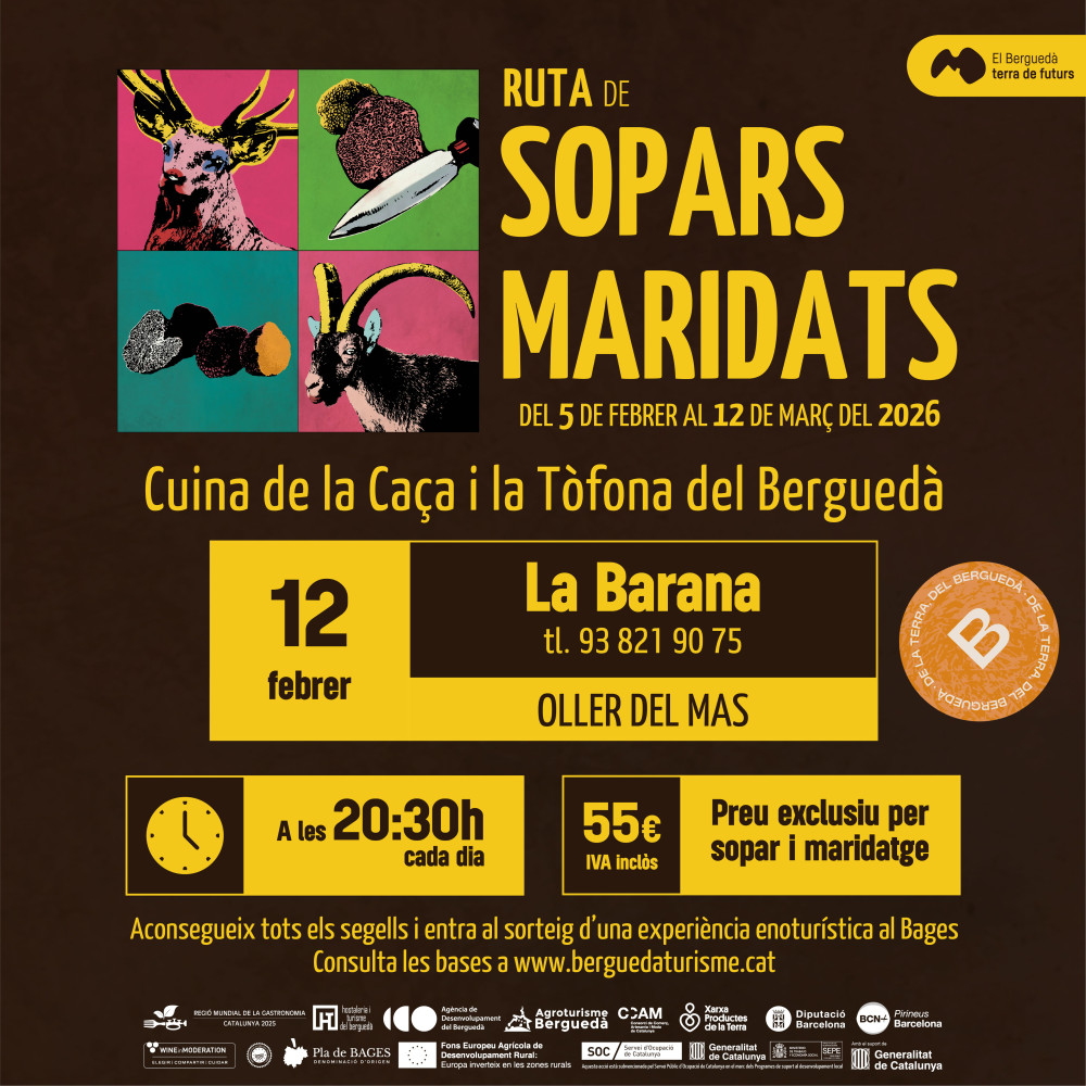 La segona parada de la Ruta és el 12 de febrer, a les 20:30 h, al restaurant La Barana de Berga i la proposta gastronòmica es marida amb vins d'Oller del Mas.