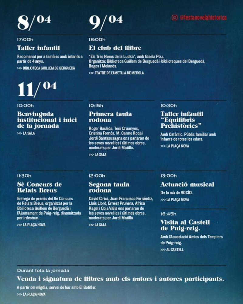 La proposta inclou taules rodones amb escriptors, activitats familiars, música i una visita al castell, així com el lliurament del concurs de relats breus. Al llarg del dia també hi ha venda i signatura de llibres amb els autors participants.