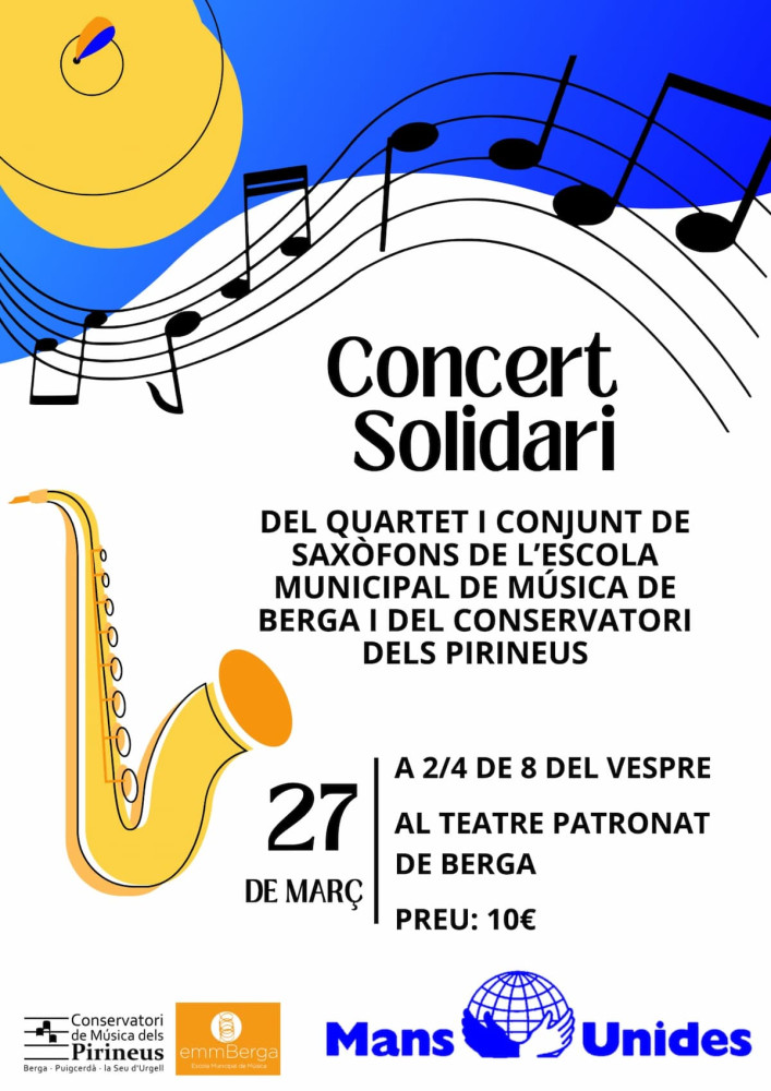 El Teatre Patronat de Berga acull divendres, a les 19:30 h, un concert solidari a càrrec del quartet i el conjunt de saxòfons de l’Escola Municipal de Música de Berga i del Conservatori dels Pirineus.