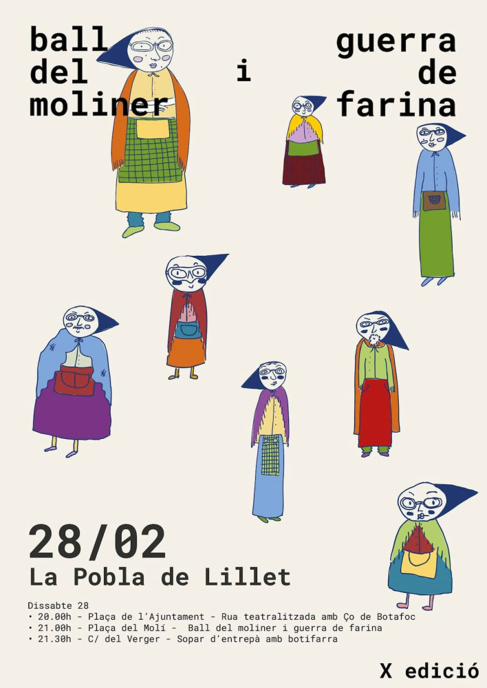 La programació comença a les 20 h a la plaça de l’Ajuntament amb una rua teatralitzada de Ço de Botafoc, continua a les 21 h a la plaça del Molí amb el Ball del Moliner i la guerra de farina, i a les 21:30 h al carrer del Verger amb un sopar d’entrepà amb botifarra.