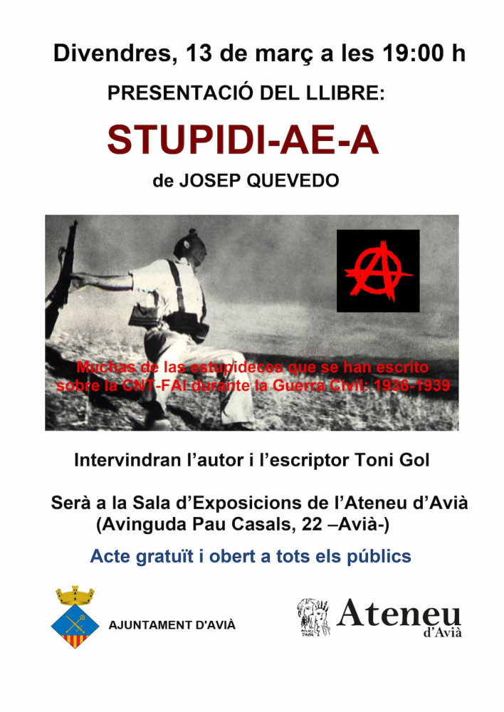 Avià acull la presentació del llibre “STUPIDI-AE-A” de Josep Quevedo el divendres 13 de març de 2026 a les 19 h a la Sala d’Exposicions de l’Ateneu d’Avià.