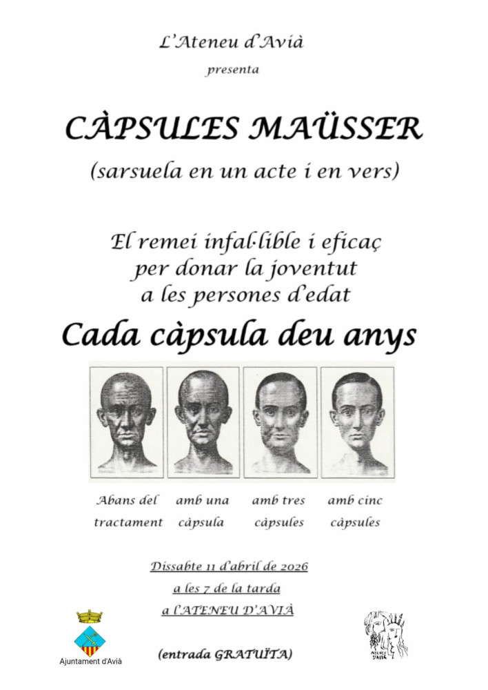 L'Ateneu d'Avià acull la representació de Càpsules Maüsser, una sarsuela en un acte i en vers que gira al voltant d’un remei per donar la joventut a les persones d’edat, on cada càpsula resta deu anys. L'entrada és gratuïta.