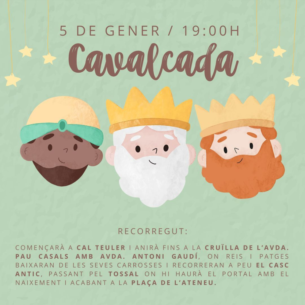 La Cavalcada de Reis se celebrarà el dilluns 5 de gener, amb inici a les 19.00 h a Cal Teuler. El recorregut avançarà fins a la cruïlla de l’avinguda Pau Casals amb l’avinguda Antoni Gaudí, punt on els Reis i els patges baixaran de les carrosses per continuar a peu pel nucli antic. La cavalcada passarà pel Tossal, on adoraran al Nen Jesús, i finalitzarà a la plaça de l’Ateneu, on Ses Majestats adreçaran unes paraules als nens i nenes del poble.
