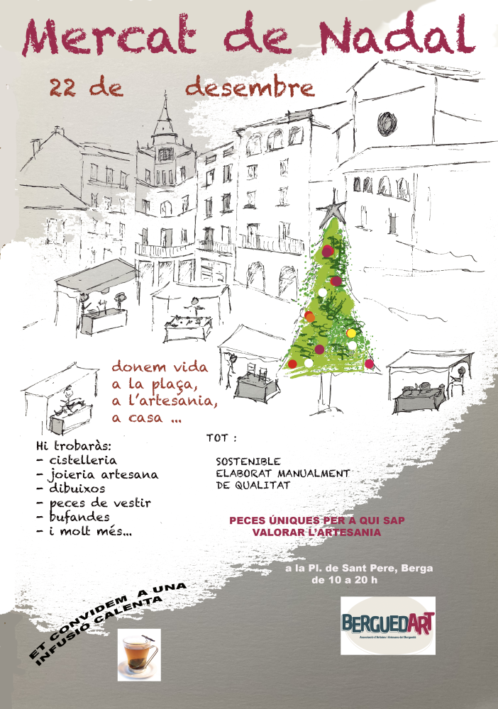 L’Associació BerguedArt organitza una fira d’artesania a la Plaça Sant Pere el diumenge 22 de desembre, durant tot el dia. A la fira hi ha cistelleria, joieria artesana, dibuixos, peces de vestir, bufandes i molt més!
