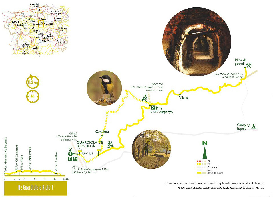Es bien conocido que el Berguedà fue una de las zonas minas carboníferas más preciadas del país. Pero, alguien sabe que del Berguedà se extraía petróleo? Esta ruta le llevará hasta la mina de petróleo de Riutort, hoy acondicionada para uso turístico * y donde, además de ver y oler el oro negro, podrá adentrarse en su conjunto de galerías, hogar de murciélagos y salamandras. Todo ello, en un bonito y escondido paraje natural al mismo límite del Parque Natural del Cadí Moixeró.